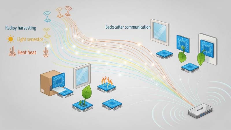At the core of Ambient IoT lies energy harvesting and ultra-low-power communication. Sensors capture small amounts of ambient energy and use highly optimized circuits to perform sensing and data transmission. In addition, backscatter communication allows devices to transmit data by reflecting existing wireless signals, which further reduces power consumption.